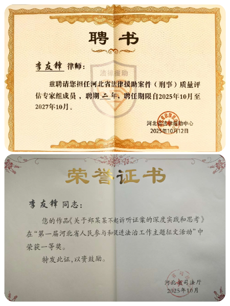 近日,農(nóng)工黨唐山市綜合二支委會(huì)黨員、河北得法律師事務(wù)所副主任李友鋒榮獲“全省法律援助工作服務(wù)之星”和“第一屆河北省人民參與和促進(jìn)法治工作主題征文活動(dòng)”一等獎(jiǎng),并被聘請(qǐng)擔(dān)任河北省法律援助案件(刑事)質(zhì)量評(píng)估專家組成員。同時(shí)榮獲多項(xiàng)省級(jí)殊榮,既是李友峰業(yè)務(wù)精湛、功底扎實(shí)的生動(dòng)彰顯,更是對(duì)他堅(jiān)守初心、積極服務(wù)社會(huì)的高度認(rèn)可。